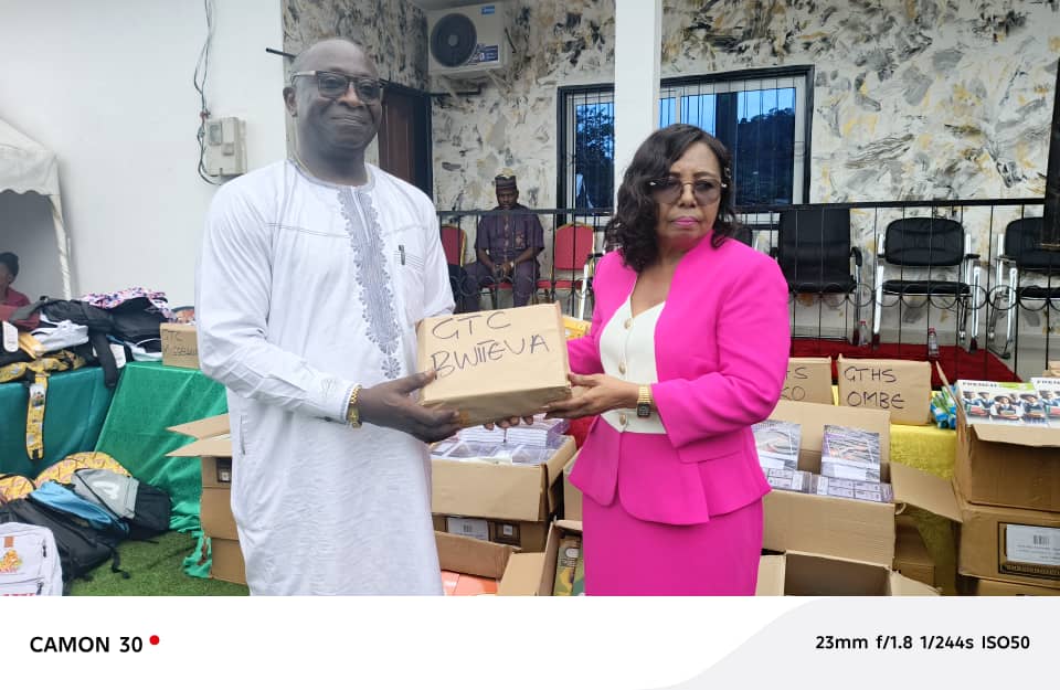 Minister Nalova Lyonga symbolically hands school package to principal of GTC Bwiteva