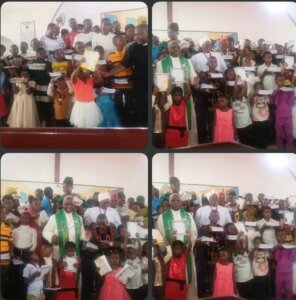 PC Mile 4 congregational chairperson, Mayor Mbwaye Eposi and Parish Pastor in group photo with beneficiaries