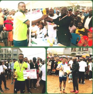Vision bearer, Prince Awonfor handing trophy to the captain of Manila FC